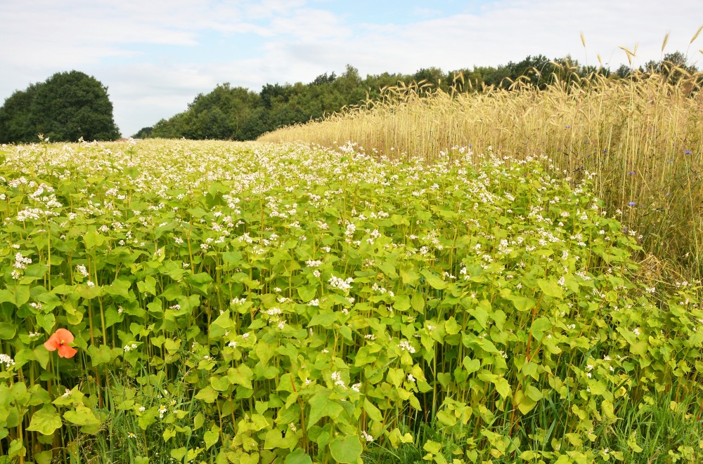 De andere twee stroken liggen langs het graspad dat de wandelaar vanaf de begraafplaats va Oud-Avereest naar Den Westerhuis leidt. Het is hier erg mooi. Lopend tussen twee hoog gelegen essen waan je je in een andere tijd. Hier vind je de paneeltjes over haver en boekweit. De gewassen doen het hier goed. Haver moet nog gaan bloeien, de boekweit is een lust voor het oog ! Het gewas staat in volle bloei en trekt nu al talloze vlinders en bijen aan.