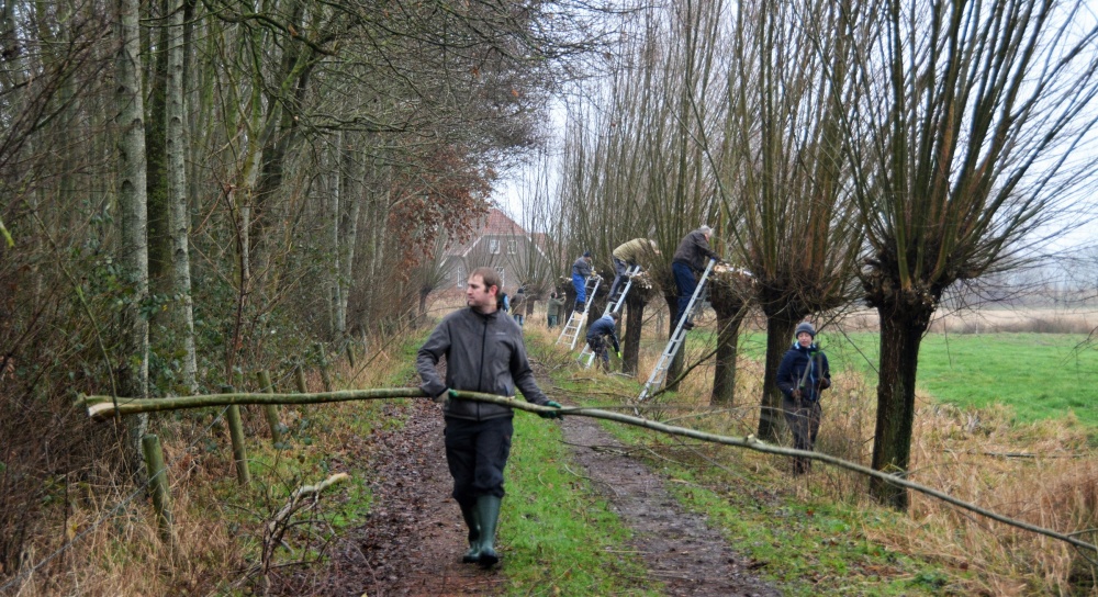 Het weer werkt op deze zaterdagmorgen 12 januari 2019 niet echt mee. Al gauw is het druilerig. Koud is het niet. Met z’n veertienen gaan we aan de slag. Chris heeft de taken goed verdeeld. De grootste groep bestaat uit knotters, de rest doet niets anders dan slepen. De afgezaagde en afgeknipte takken, in de wereld van de wilg spreken we over tenen, mogen niet op de oprijlaan blijven liggen. Ze worden aan de rand van het hooiland neergelegd. Van wilgentenen kun je soms niet meer spreken, ze zijn zo dik en lang, complete bomen worden uit de