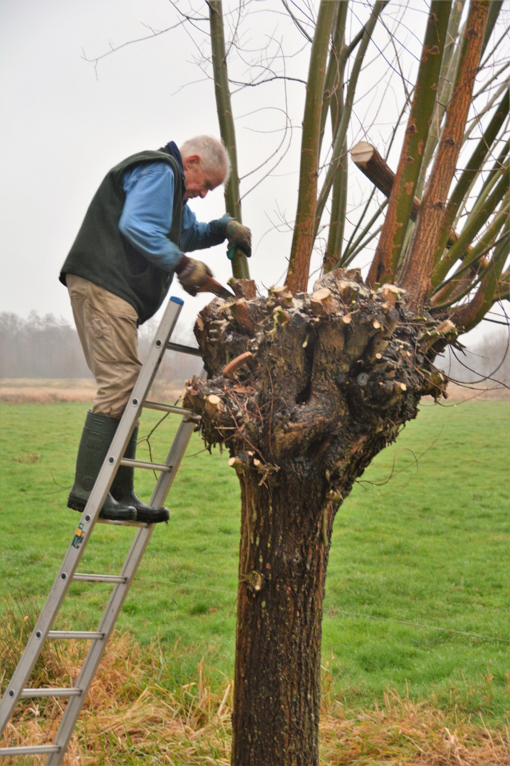 Wilgen knotten is een typische winteractiviteit. Vanuit het gereedschapsdepot van Landschap Overijssel (op landgoed De Horte bij Dalfsen) rijden deze maanden talloze aanhangers met ladders, zagen, takkenscharen e.d naar vaak prachtige plekken in onze mooie provincie. Ook onze vrijwilligers van de werkgroep landschapsbeheer mogen op zo’n mooie plek aan het werk. Langs een oprijlaan haaks op De Mulderij bij Dedemsvaart staat een lange rij knotwilgen. Vier jaar geleden zijn ze voor het laatst van hun tenen ontdaan. Nu zijn ze weer aan de beurt. Verderop in de hooilanden bij de Reest staan er nog meer, maar daar zijn we nog lang niet aan toe.