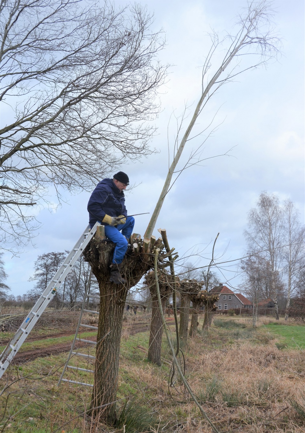 De wilgen die we bewerkten waren vier jaar geleden voor het laatst geknot. Dat gaat ons dus niet weer overkomen. Nou ja, volgende winter nog een keer. De meer dan twintig wilgen die verderop in de hooilanden staan zijn volgende jaar ook weer vier jaar lang niet geknot. Maar daarna, dan hebben we alles weer onder controle. Misschien nemen we ze dan wel om de twee jaar onder handen. Van wilgentenen kon je nu vaak niet meer spreken, er werden complete bomen uit de knot gezaagd, zo zwaar en dik waren de takken. Het wegslepen van de takken was dus ook best zwaar. In opdracht van Landschap Overijssel was de houtsingel grenzend aan de oprijlaan een paar weken geleden afgezet. Nu ook de wilgen zijn geknot heeft het landschap hier een totale metamorfose ondergaan. Dat is wel even wennen, maar je staat er versteld van hoeveel dynamiek de natuur straks laat zien. Elzen en eiken in de houtsingel gaan weer mooi uitlopen en voordat je het weet dragen de wilgen weer een prachtige pruik.