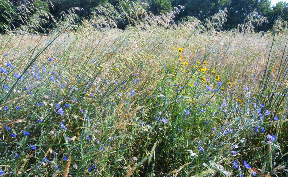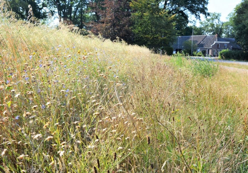 Naast het fietspad langs de Meppelerweg ter hoogte van de Reestkerk in Oud/Avereest zaaiden we langs een es met winterrogge een akkerrand in met eenjarige akkerbloemen in combinatie met boekweit en drie granen. Het begin van de zomer was veelbelovend. Met enige regelmaat viel er wat regen, zodat de zaden konden ontkiemen. Boekweit overheerste in combinatie met korenbloemen. Daarna kwam de droogte. De felle zon deed de rest. Bloemen als gele ganzenbloem en bolderik kregen het moeilijk. Ze staan er nu wel, maar helaas mondjesmaat. Kamille en klaproos zijn nauwelijks opgekomen. Waarschijnlijk te droog. Wat ook veel voorkomt bij slagregens is het wegspoelen van zaadjes. Al met al een beetje teleurstellend deze akkerrand. Je ziet in het boerenland ook vaak randen die ingezaaid zijn met phacelia, bladrammenas, kaasjeskruid en gele mosterd. Landschap Overijssel kiest echter samen met ons voor inheemse akkerbloemen. Daar past een mooie plant als phacelia niet in.