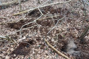 Het nalopen van een serie nestkasten is verre van saai. Met een broedseizoen in volle gang is er natuurlijk genoeg te beleven. In geen enkele kast gebeurt hetzelfde. Tijdens de controle gebeurt er ook genoeg om je heen: roffelende spechten, een geschrokken ree die er van door gaat, bloeiende lelietjes van dalen, noem maar op. Zover is het nog niet. De natuur is in rust. Dat geldt zeker niet voor de familie das. Een paar honderd meter verder ligt een grote bewoonde burcht. Bij nestkast H85 is de bosbodem omgewoeld en zie ik een heleboel gegraven putjes. In een groot aantal liggen zwarte, vette glimmende drollen. En niet zo weinig ook. Een dassenlatrine ! Van dassen is bekend, dat ze hun behoefte doen buiten de burcht, soms dichtbij, vaak ook een behoorlijk eind verder. Nou, deze familie kan er wat van ! Een kleine 50 meter verder ligt nog zo’n dassentoilet. Leuk om te zien.