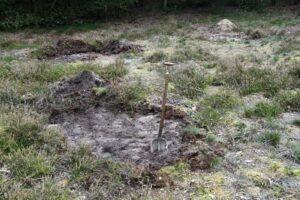 vuilboom) wordt verwijderd. Dat doen we met veel plezier, maar dat is nog niet alles. We leggen ook zandplekken aan voor insecten en hagedissen, plaggen hier en daar wat stukjes op plekken waar de heide is verdwenen of vermost en we leggen aan de rand van het bos grote takkenrillen aan. Daar helpen we de vogels en kleine zoogdieren mee. Na twee middagen zijn we erg tevreden over het resultaat, maar het project is nog lang niet klaar. Dat hoeft ook niet, we hebben de tijd tot 15 maart 2021. Bovendien werkt de werkgroep ook nog op een paar andere locaties: Takkenhoogte en het Rabbingerveld. De werkgroep bestaat uit acht personen en komt iedere week een middag bij elkaar.