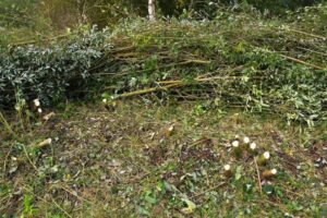 Met z’n elven op een mooie zaterdagmorgen (9 oktober 2021) een bijna tweehonderd meter lange wilgensingel afzetten mag je rustig een hele klus noemen. Landschap Overijssel bezit naast de afrit van de N48 bij de carpoolplaats van Balkbrug grasland en houtsingels. Deze sluiten mooi aan op het Landgoed Kategerbos. Ooit waren er plannen om hier met de aanleg van een ecoduct een ecologische verbinding te maken tussen het Reestdal en het Vechtdal. Het kwam er nooit van. Wat wel werd gerealiseerd was het naastgelegen bedrijventerrein Katingerveld en een idiote met camera’s en alarmsystemen beveiligde faunapassage waar eventuele overstekende reeën en andere dieren net zo makkelijke worden doodgereden als op een drukke A28.