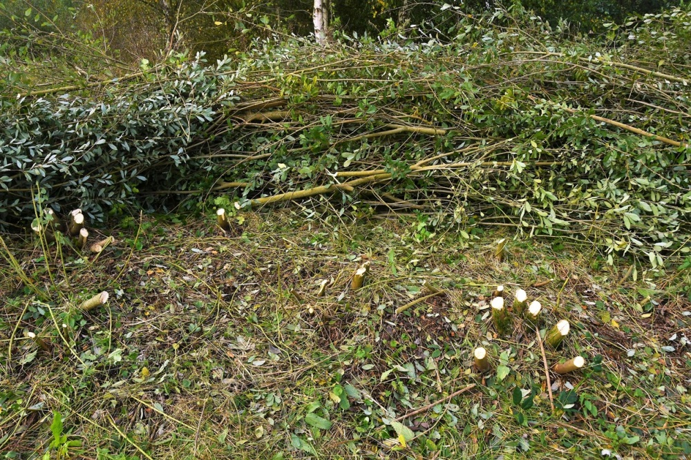 Het zagen van niet al te oude wilgen behoort niet tot de categorie zwaar werk. Het hout is namelijk zacht, de zaag vliegt er door heen. Met een takkenzaag knip je nog behoorlijk dikke takken. Dat is het werk niet. De meeste tijd gaat in het aanleggen van takkenrillen. De takken (soms halve bomen) worden in één richting op elkaar gelegd. Warrig hout en uitstekende takken moeten worden geknipt. Uiteindelijk ontstaat een lange vrij regelmatige muur van takken. Takkenrillen geven heel veel dieren bescherming en onderdak. Symbolisch was misschien wel de pad, die schrok van al die herrie en zo snel mogelijk onder de berg takken verdween. Rond twaalf uur was de klus zo goed als klaar.