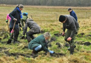 plantgaten gegraven. De bedoeling was om de boompjes voor de winter te planten. Er werd een datum afgesproken : zaterdagmorgen 4 december 2021. Maar…Corona ! Het festijn werd afgelast. Gelukkig kwam op 29 januari een tweede kans. Afstand houden lukte niet altijd, maar over het algemeen werd op grote afstand van elkaar in kleine groepjes gewerkt. Het enthousiasme onder de dames was groot. Gezellig was het ook. Aan het begin van de morgen was er koffie en koek en tijdens de lunch genoot iedereen van heerlijke pompoensoep. Rond 13.00 u. was de klus klaar en stonden meer dan 400 boompjes en struiken en de twee grote lindebomen in de grond. Nu mocht moeder natuur het overnemen. Hopelijk staan er over een paar jaar vijftien kleine bosjes met veel besdragende struiken in de rand van het westelijke deel van het Rabbingerveld. Ideaal biotoop voor insecten en vogels !