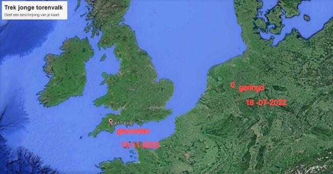 Dan krijgt Henri een terugmelding over ringnummer NLA …3844582. De jonge valk uit De Belt. Uit Groot Brittannië. Om precies te zijn uit Bow in zuidwest Engeland. De afstand tussen De Belt en Bow is 734,9 km. Op 13 november 2022 dood gevonden in een klein Engels dorpje. Van de omstandigheden, doodsoorzaak e.d. is niets bekend. Tegen een raam gevlogen ? Verkeersslachtoffer ? Wist ie niet dat de auto’s daar vooral van links komen ? Ook interessant: wat heeft deze vogel bezield om de Noordzee (of het Nauw van Calais) over te steken en zijn/haar geluk in Groot Brittannië te zoeken ? Meegenomen door een noordoostelijke wind ? Te veel drukte gezien in ons land en te weinig plekken met muizen ? We zullen het nooit weten. Maar met de beschikbare informatie over de trek van jonge torenvalken kunnen we wel zeggen dat dit een heel avontuurlijk exemplaar is geweest.