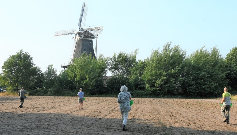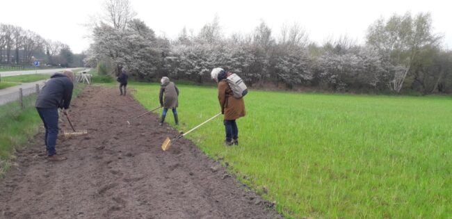 Het zaaien doen we vanuit de zaaikorf. Alles op de ouderwetse manier met de hand. We werken de zaden met grote (hooi)harken onder. Een behoorlijke klus, maar met zijn vijven kun je veel in relatief korte tijd. Op de volgende locaties hebben we akkerranden ingezaaid: