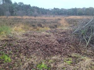 ,maar ook voor reptielen is het belangrijk dat heideterreintjes niet geïsoleerd raken, maar dat ze een verbinding vormen. Dus werd de strook beplanting weggehaald. Dat leverde nog meer natuurwinst op, want de afgezaagde takken werden op stapels (rillen) gelegd. Deze takkenbossen zijn ideale broedplekken voor vogels als winterkoning, roodborst en heggenmus, maar bieden ook schuilplaatsen voor kleine zoogdieren. Aan het eind van de morgen was de klus geklaard en gingen de 14 vrijwilligers voldaan naar huis.