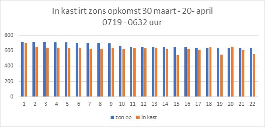 In de eerste week is de steenuil, tot onze schrik, drie dagen weggebleven. Vanaf 22 maart, toen hij terugkwam om 544 uur, ontstond een regelmatig patroon tot 20 april. Grofweg kroop de steenuil iets voor zonsopkomst in de kast, bleef de hele dag in de kast en vertrok iets na zonsondergang weer uit de kast.