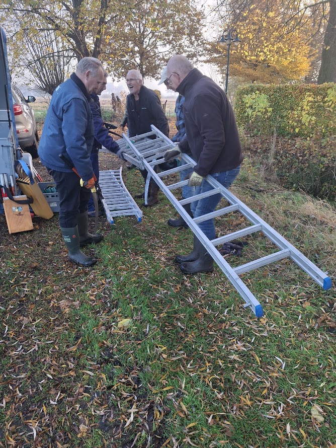 Aangekomen bij de wilg is de eerste klus het wegknippen van de dunnere twijgen. In de wilgenwereld spreken we niet van takken of twijgen, maar van tenen. Daarna is er ruimte voor de zaag, een trekzaag met een handvat en een smal gebogen zaagblad. Met dit fijn getande gereedschap kun je de dikkere tenen zagen, als het lukt een paar centimeter boven de knot. Alle tenen mag je over de sloot gooien. Aan de overkant worden ze op rillen gelegd. Ben je nog een beetje soepel in de spieren, dan lukt het misschien ook nog om zittend boven in de knot de laatste tenen af te zagen. Zwetend, moe maar erg voldaan kijk je dan trots naar jouw geknotte wilg. Dat heb ik dan toch maar even gefikst ! Pittig werk is het , je kunt je calorieën wel kwijt. Bewegen ,bewegen en nog eens bewegen, dat is toch gezond voor lichaam en geest ? Dat moe zijn aan het eind van de morgen , dat omkijken naar die rij wilgen die er nu allemaal heel anders uitzien, het samenwerken, dat inademen van de frisse lucht, het zou zo maar de derde motivatie kunnen zijn om met deze klus mee te doen.