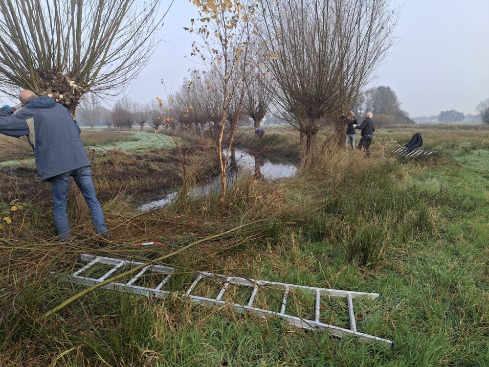 het wilgen knotten. Dat is ook wel te verklaren. In de eerste plaats doen we dat op een hele mooie locatie in de bovenloop van het Reestdal. Krok heet die plek, het ligt bij De Mulderij vlak bij Dedemsvaart. Veel natte hooilanden, de wilgen staan langs een oprit en langs een sloot. Het uitzicht over het beekdal is magnifiek, vooral vanaf de ladder of, nog mooier, als je bovenin een bijna geknotte boom zit. De tweede verklaring moeten we zoeken in de aard van het werk. Die is namelijk behoorlijk gevarieerd en arbeidsintensief. Met een ladder, zaag en takkenschaar het beekdal in op zoek naar jouw wilg. Goed kijken waar je loopt, want de aangrenzende hooilanden zijn kletsnat, op sommige plekken staat zo’n 20 of 30 cm water. Meer dan 30 wilgen staan hier langs een slootkant, ze zijn drie jaar terug voor de laatste keer geknot.