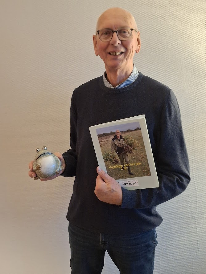 Op alle vrijwilligersavonden sinds 2018 delen we De Groene Opkikker uit. Deze onderscheiding is voor de vrijwilliger van het jaar. Wout Groenewold is misschien nog niet zo heel erg lang vrijwilliger bij onze club, maar de hoeveelheid tijd die hij de afgelopen vijf jaar in het landschap heeft lopen zagen, knippen, spitten, planten en nog veel meer, is indrukwekkend. Wout is actief in de kleine groep ( dinsdag- en woensdagmorgen, de zaterdagwerkgroep ( tweede zaterdag van de maand) en de werkgroep Rabbingerveld (elke donderdagmiddag) Naar de sportschool gaat hij al lang niet meer, Wout is de ambassadeur voor natuurfitness in het landschap! Van voorzitter Jan ontvangt hij de Groene Opkikker en een fotoalbum. Het verrast hem, maar hij is er erg blij mee. Je hebt deze prijs echt verdiend Wout!