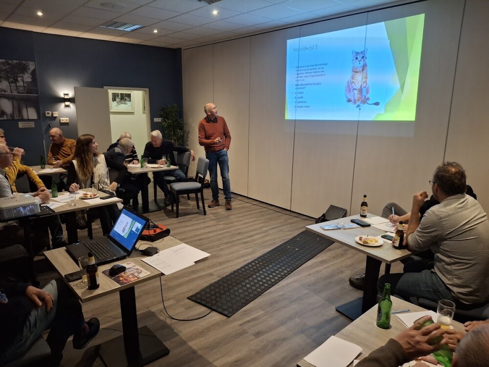 Na en tijdens de koffie/thee krijgen de dames en heren in de zaal een kaart uit een dierenkwartet. De opdracht hieraan gekoppeld is duidelijk: zoek twee andere dieren uit jouw groep. Het wordt dan echt gezellig. Iedereen loopt door elkaar en is op zoek naar een ander reptiel, amfibie, zoogdier, insect of huisdier. Na een poosje zitten alle groepjes klaar, ze bestaan uit drie personen. Antwoordbladen worden uitgedeeld, de pub quiz over natuur van dichtbij naar veraf kan beginnen. Op het scherm verschijnen 50 vragen, verdeeld over vijf thema’s : Reestdal, Regio, Nederland, Europa, Wereldwijd. Elke thema heeft tien vragen, totaal te behalen punten: 50 De vragen op het scherm zijn erg divers: soms makkelijk, meestal lastig, soms met een hoog gokgehalte. Rienk en Jan presenteren ze om en om.Veel overleg in de groepjes, samen weet je meer. De eerste prijs ( chocoladeletter) is voor de groep die 36 punt haalt. Knap !