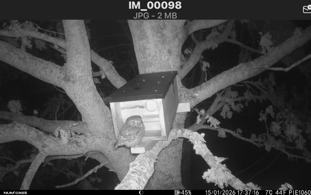 Eind januari, tenslotte, hebben we een minicamera opgehangen in een nestkast, zodat we op die locatie de steenuil zowel buiten als binnen kunnen volgen.