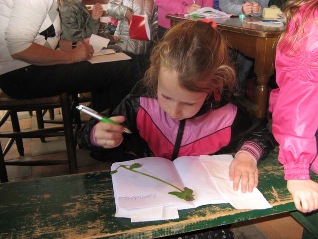 te laten zien.We gingen met elkaar bloemen zoeken en er werd verteld hoe ze heten. Dit moesten de kinderen onthouden. Sommige kinderen waren onderweg aan het oefenen, de bekende soorten zoals de paardebloem en het madeliefje wisten ze nog. De soorten die we zagen waren bijvoorbeeld witte dove netel, paardenbloem, krentenbloesem, dotterbloem, vogelmuur, hondsdraf en speenkruid.Terug in de Wheem kregen de kinderen een glas ranja en gingen we een herbarium maken Elk kind kreeg een schrift met vloeipapier. De bloemen werden ingeplakt en de naam er bij geschreven.Er werden nog wat dia’s vertoond over bestuiving van de bloemen. Om 4 uur ging iedereen voldaan naar huis.