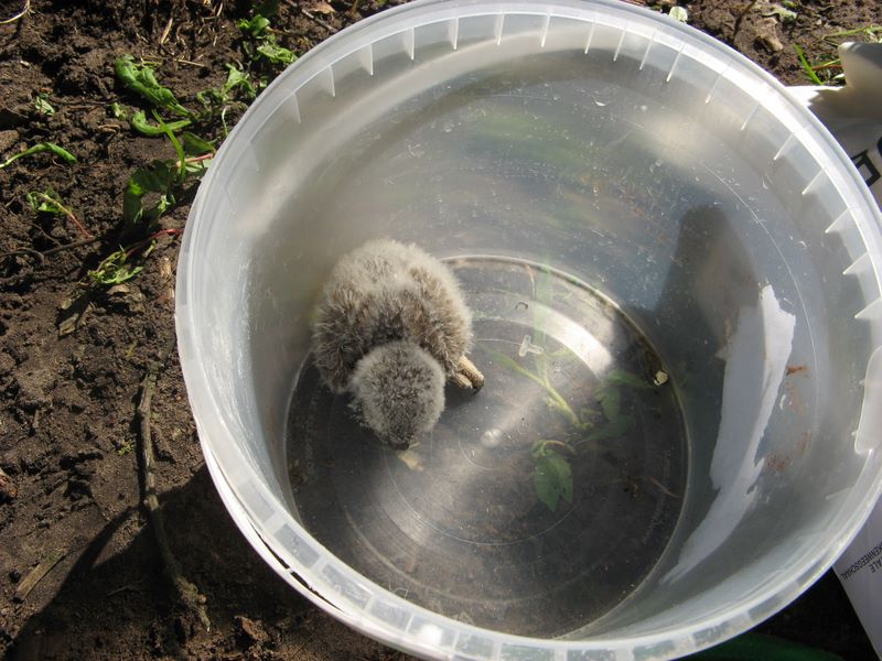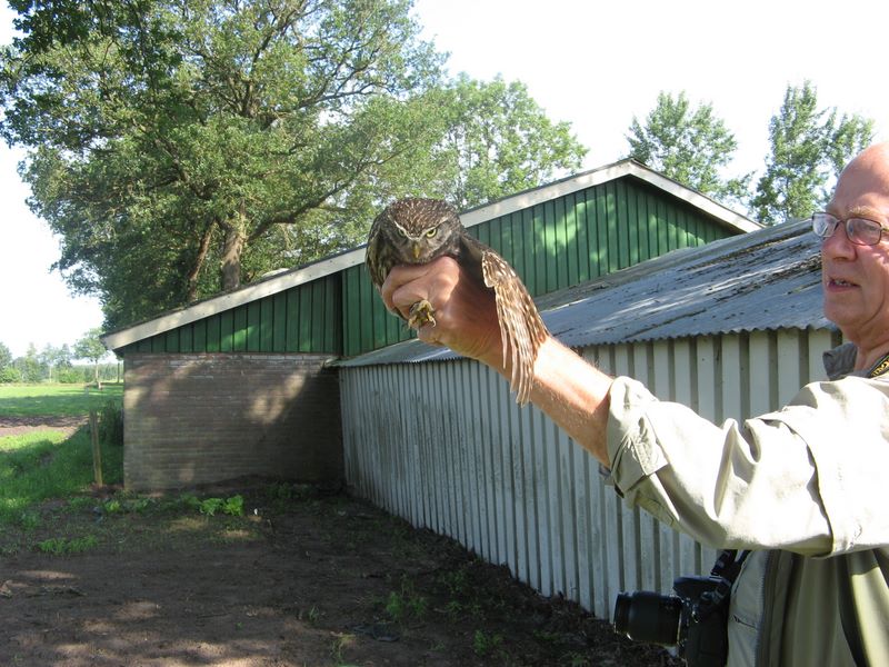 Wij hebben op 10 juni onze eerste steenuiltjes geringd. Het waren er twee, de andere 2 eieren waren niet uitgekomen. Ze waren 12 of 3 dagen oud, dat kunnen we zien aan het gewicht en de vleugellengte: 12 + 26 broedtijd = 38 dagen. Dus het eerste ei is op 3 mei gelegd. Het ringen is erg belangrijk, zo krijgen we informatie over de trek van de steenuil. We hadden een steenuil in de kast met een ring om, de steenuil bleef in de kast zitten, je kon hem zo pakken en de ring aflezen. Dat nummer kun je invoeren bij het Vogelringstation. Je krijgt de gegevens vanzelf toegestuurd. Deze steenuil kwam uit Staphorst en was 9 km van huis. Hij is nu 371 dg oud. Het gewicht van de jonge steenuilen was 97 en 102 gram. De vleugellengte was 36 en 45 mm. Er lagen nog 2 dode muizen in de kast op voorraad en dat was ook te ruiken. Verder was de kast wel schoon.