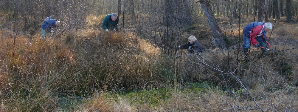 boompjes en struiken te weinig licht. Dus moest deze opslag worden verwijderd. Aan het eind van de morgen kon de werkgroep tevreden kijken naar een groot aantal open veengaten, waar straks naar de winter de waterflora weer krijgt wat het nodig heeft: zonlicht.