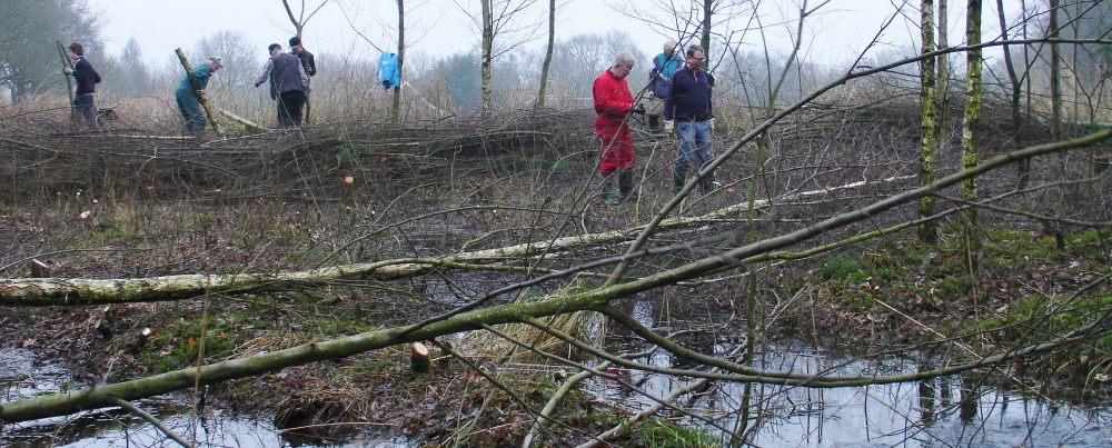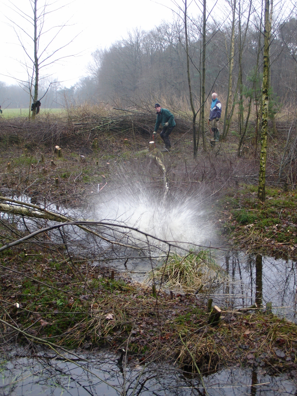 toegepast om bossen te ontwateren. De bomen en struiken dienden dan vaak als brand- of geriefhout. Rabattenbosjes hebben onderhoud nodig. De greppels moeten regelmatig worden uitgediept en de houtwalletjes moeten om de zoveel jaren worden afgezet. Op deze zaterdag werd een begin gemaakt met het afzetten van de talloze vaak kaarsrecht omhoog gegroeid bomen, veelal berken en elzen. Erg dik waren ze nog niet, maar aan het eind van de morgen was er toch zo’n vier kuub brandhout geproduceerd. De belangstelling voor deze klus was prima. Achttien harde werkers, waaronder vier scholieren voor hun Maatschappelijke Stage, konden rond de klok van 12 tevreden terug kijken op een werkmorgen met een mooi resultaat. De komende twee jaren gaat de werkgroep door met het onderhoud van dit bijzondere stukje bos.