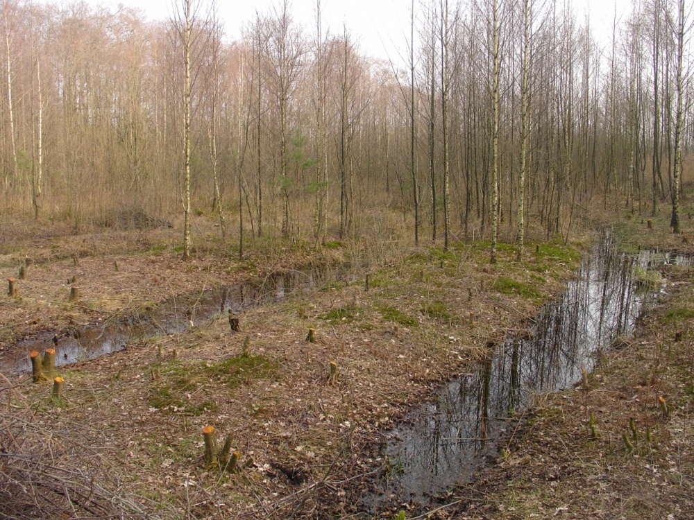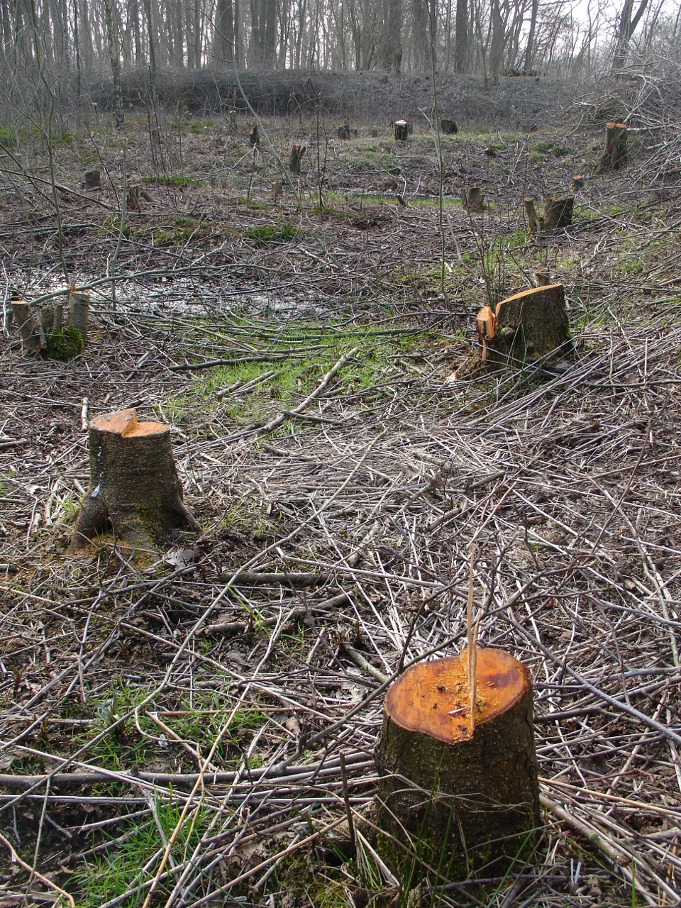 d van een greppel. Misschien op zoek naar de eerste ontwaakte kikkers en salamanders. Een mooie gezicht zijn al die oranjerood gekleurde elzenstammetjes. De stapel verzameld hout bestaat dan ook vooral uit elzenhout. Nu de bomen nog kaal zijn, is de opbouw van het bos goed te zien. Smalle opgehoogde wallen in 2003 beplant met bomen, afgewisseld door lange rechte greppels. Over twee/drie jaar hebben we alle rabatten (stroken) afgezet. Dan zal het bos zich verder ontwikkelen. De elzen zullen weer uitlopen en de begroeiing wordt dichter. Misschien dat dan ook de greppels moeten worden uitgebaggerd. De natuurwaarde van dit stukje Haardennen gaat er in ieder geval op vooruit.