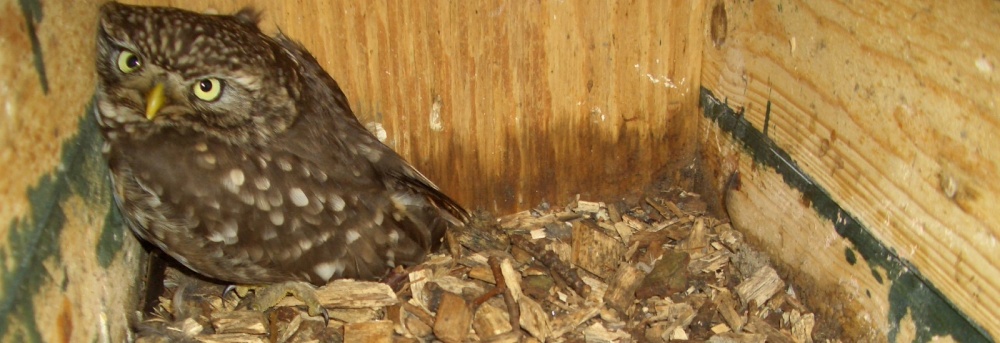In de tweede kast zaten 5 jongen (12 dagen oud) + het vrouwtje. Deze was al geringd op 10-6-2011 in Staphorst 9 km hiervandaan en was 728 dagen oud. En er zitten nog twee paartjes in een oude schuur maar daar kunnen we helaas niet bij komen. We weten niet hoeveel eieren of jongen die hebben. Totaal hebben we minder steenuiltjes dan vorig jaar. Jammer, in de kasten die niet bezet waren door steenuiltjes zaten allemaal spreeuwen, maar die komen pas in de kast als er geen steenuiltje in zit.