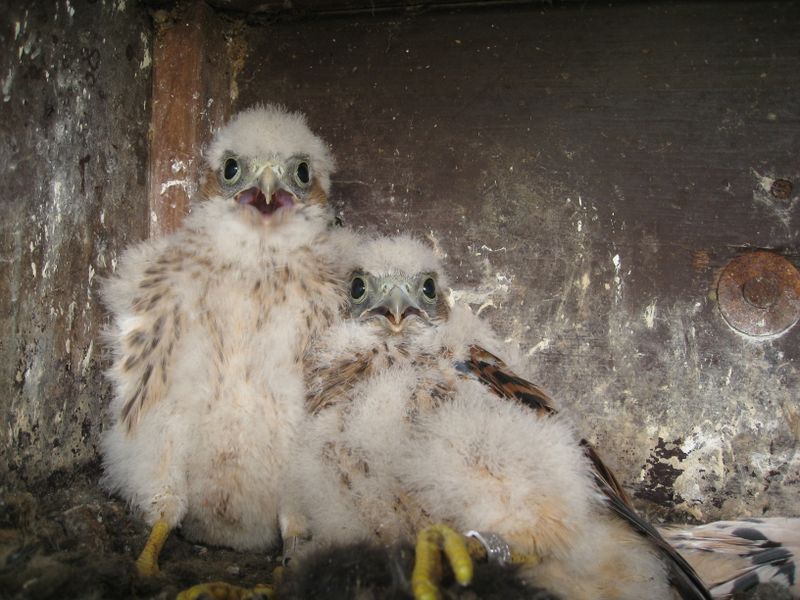 Jonge torenvalken maken altijd veel herrie. Als je ze pakken wilt gaan ze op de rug liggen en schreeuwen moord en brand en proberen je te grijpen met hun scherpe klauwen. Maar met een beetje handigheid kom je heelhuids uit de strijd.