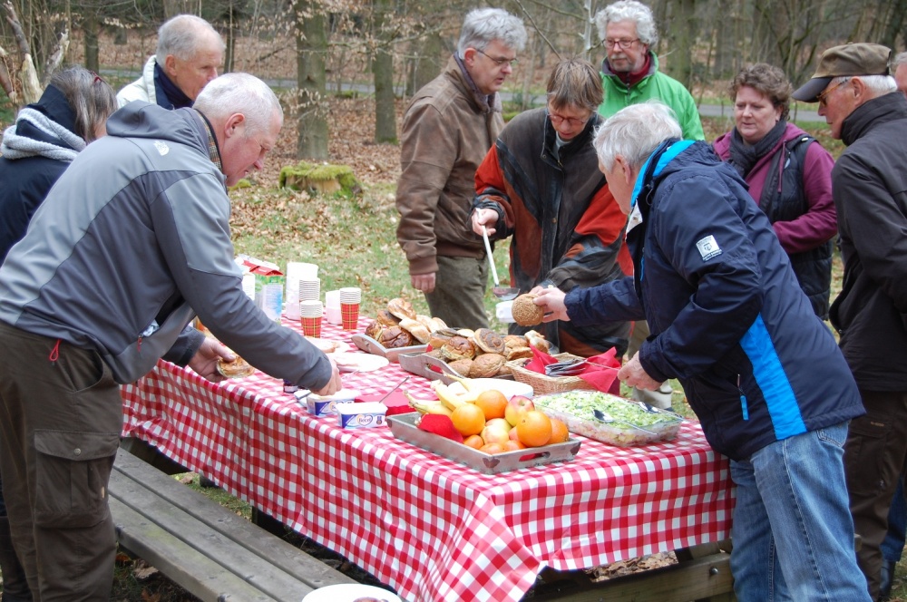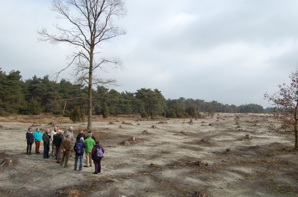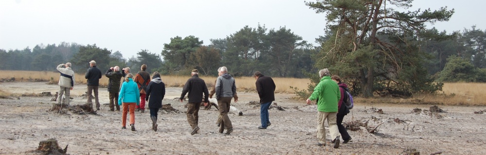 dieren. De invloed van de natuurbeheerder is de afgelopen jaren groot geweest. Behalve het kappen van grote percelen bos werd landbouwgrond omgezet in natuurgebied, op een aantal plekken kon het oorspronkelijke natuurlijk reliëf in het landschap hersteld worden, werden exoten (buitenlandse bomen) verwijderd, zijn sloten n greppel gedempt om meer water in het gebied te houden en nog veel meer. Gids Bram wist er veel over te vertellen en liet de groep een aantal mooie locaties zien. Aan het eind van de twee uur durende excursie werd de morgen afgesloten met een goed verzorgde lunch.