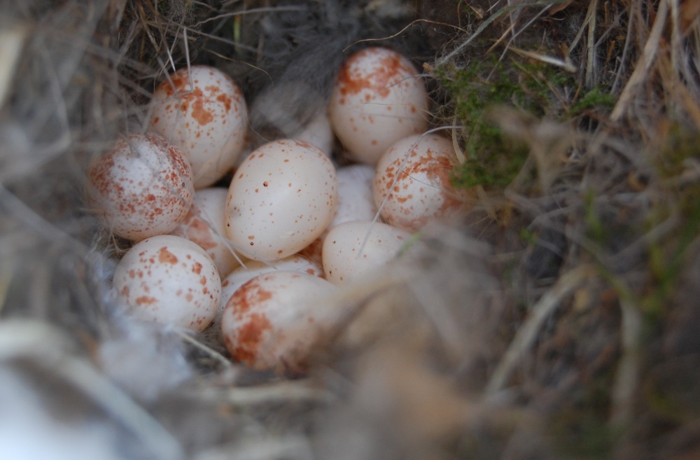 De eerste controle van de nestkasten is licht teleurstellend, er zijn nogal wat kastjes leeg. Gelukkig zijn de bonte vliegenvangers weer terug! Veel nestjes in aanbouw, in twee kastjes liggen al twee en drie groenblauwe eitjes. In een ander kastje heeft een pimpelmees al 12 eitjes gelegd.