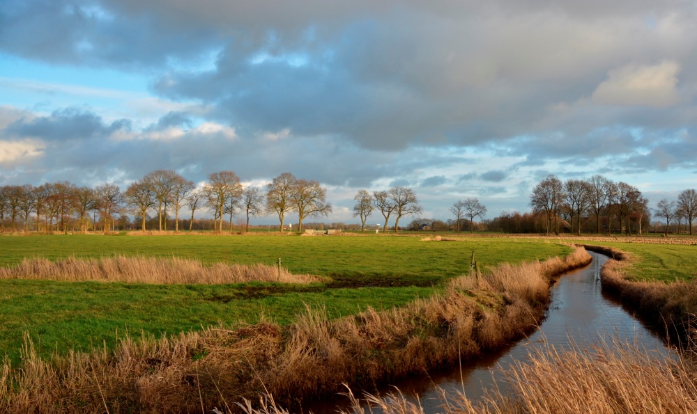 De bovenloop van de Reest is niet het meest aantrekkelijke deel van het beekje, het landschap is er nogal vlak, maar tegenover het kerkhof aan de Mulderij ten noorden van Dedemsvaart heeft die vlakte en het weidse uitzicht grote schoonheid. De smalle Reest meandert hier door de natte hooilanden. Afgestorven grassprieten geven het landschap randen van goud als de avondzon er op schijnt.