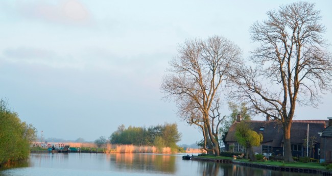 niet lang. Ruim voor zonsopgang, rond de klok van 06.30 u, kwam het ochtendlicht heel snel. Prachtige luchten leverde dat op. Onderweg vertelde de gids over het ontstaan van het landschap, de flora en fauna en natuurlijk de rietcultuur. In dat riet lieten rietzanger, snor en rietgors zich horen. In de hooilandjes en langs de oevers bloeiden de dotterbloemen, pinksterbloem en kleine valeriaan. Het moeraskartelblad liet zich ook al zien. Meerdere malen liet het reewild zich bekijken.