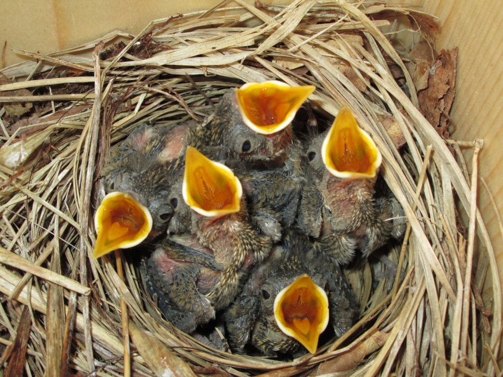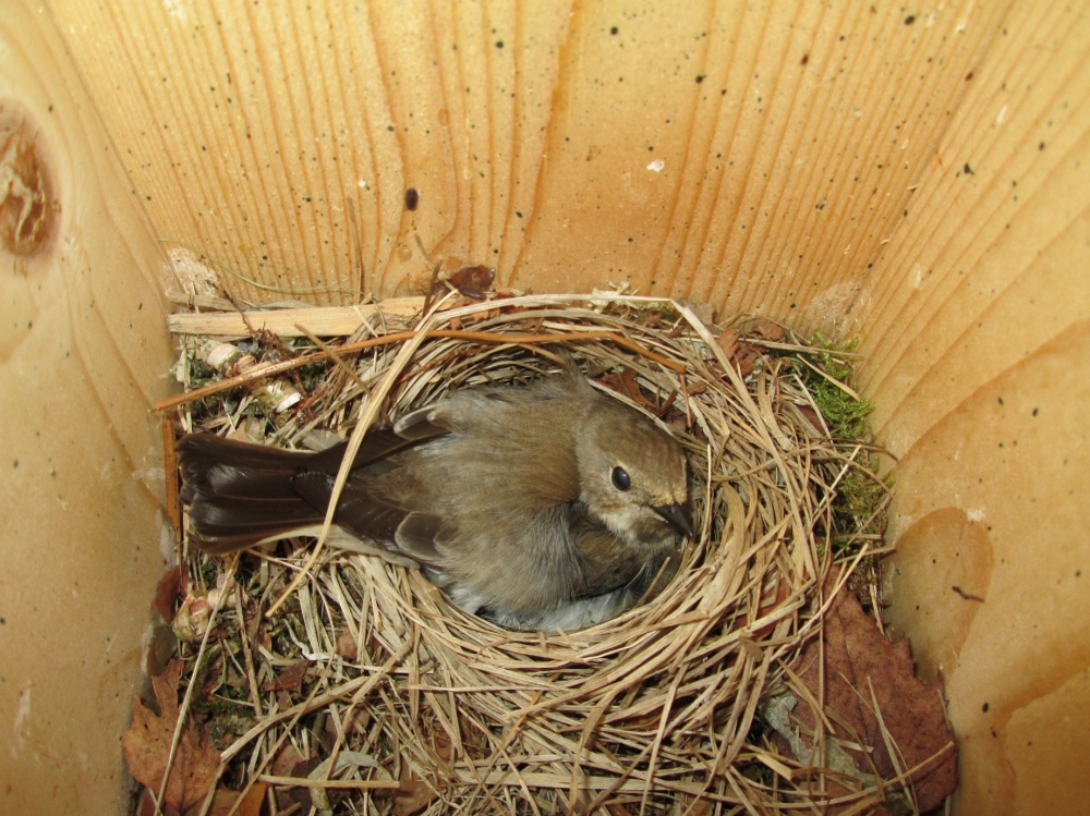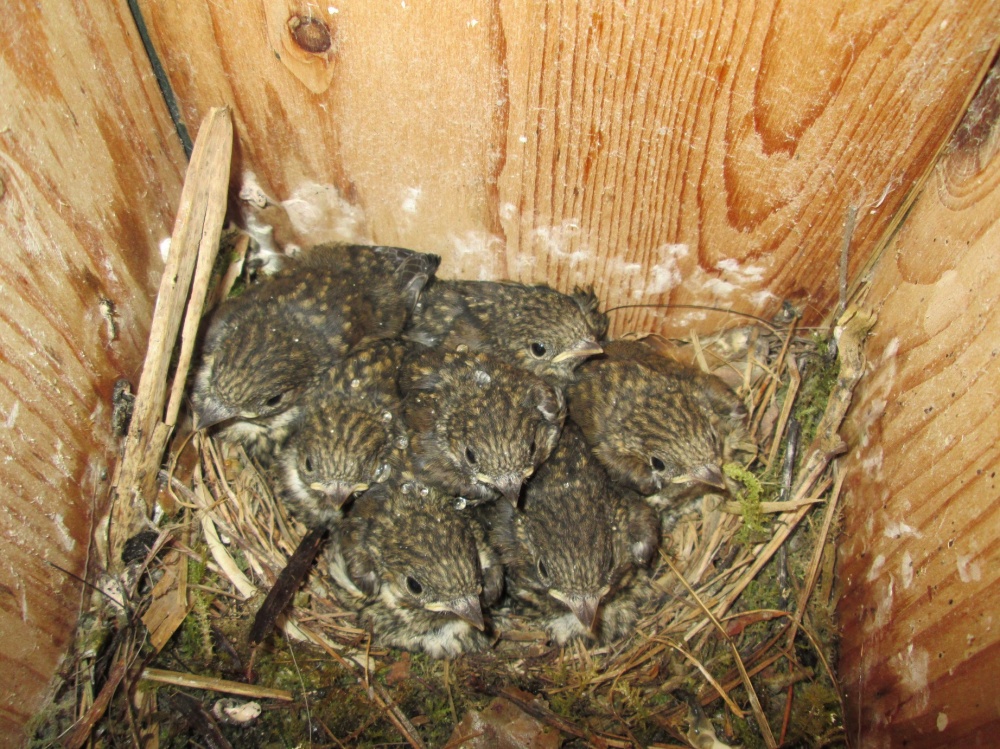 Het blijft een mooi gezicht, een kastje met daarin een nestje van zeven niet al te knappe jonge bonte vliegenvangers. Ze zien er niet uit. Het uiterlijk bestaat uit een grote bek met daar achter een bonte combinatie van dons, dekveren en slagpennen.