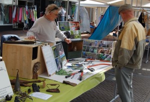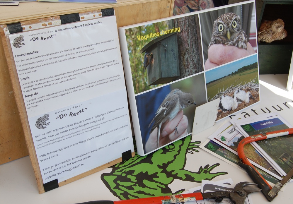 Een braderie is niet de meest geschikte manifestatie om je als club te profileren. Veel vakantiegangers, die met heel andere dingen bezig zijn. Veel bezoekers dus uit andere delen van het land. Niet bepaald onze doelgroep. Je hoopt dan op mensen uit het dorp of uit de omgeving die het Reestdal kennen en belangstelling voor natuur en landschap hebben en………. die nog niet lid zijn van de nwg de Reest. En waren die er? Ja, die hebben we ontmoet. Er kwamen best veel mensen bij onze stand kijken, die we vertelden wat we deden en waarom we deelnamen aan deze braderie. Het leverde ook een aantal nieuwe vrijwilligers op voor de werkgroep landschapsbeheer. Daar zijn we erg blij mee !