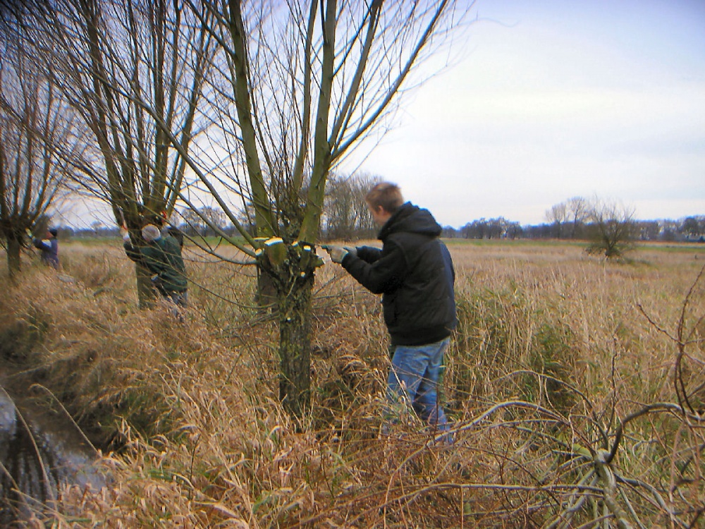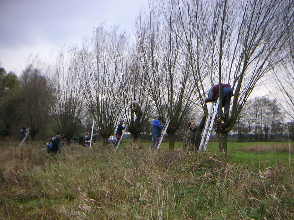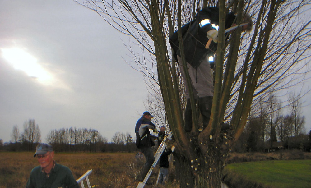 Zaterdag 14 november werd door een grote groep vrijwilligers en maatschappelijke stagelopers wilgen geknot aan de Mulderij. Het waaide hard, maar het bleef droog … hoewel. Na de snert-pauze begon het toch te druppelen en de laatste wilg werd in de stromende regen geknot. Vrijwiligers van het ooievaarsstation hebben de wilgen tenen meegenomen voor de ooievaarsnesten.