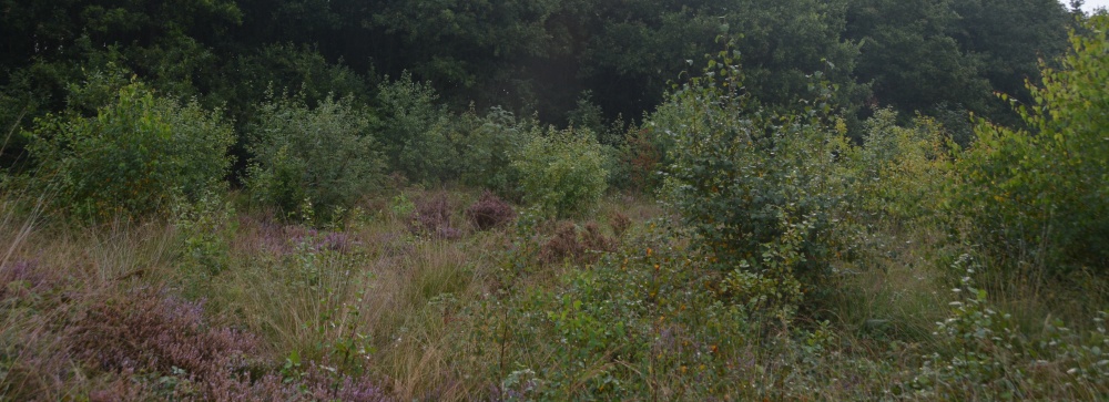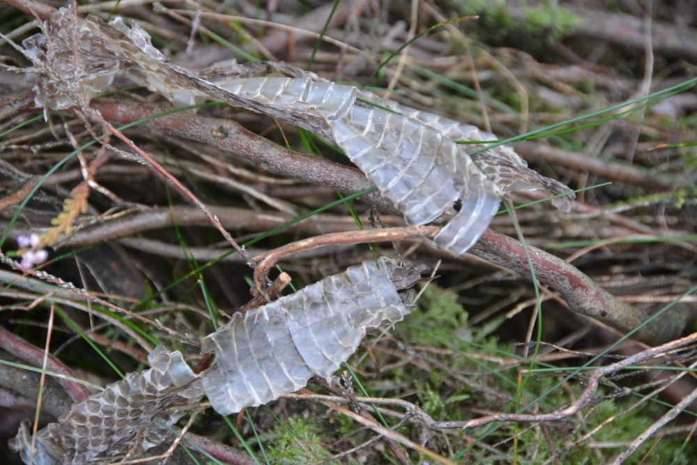 De heide ziet er mooi uit, maar bepaalde delen zijn bezig dicht te groeien. Talloze zaailingen van vooral berk en vuilboom proberen de struikheide te verdringen. Een normaal proces, dat successie heet, maar dat niet wordt getolereerd. Tenminste niet op deze plek. Hier wil Landschap Overijssel de heide graag open houden. Dus werden er honderden boompjes uit de hei gestoken, gesnoeid en gezaagd. De oogst werd in rillen in de bosrand neergelegd. Mooie schuilplaatsen voor klein wild. Zo snijdt het mes weer aan twee kanten. Opmerkelijk was de vondst van een slangenhemd, een vervelde huid van (waarschijnlijk) een adder.