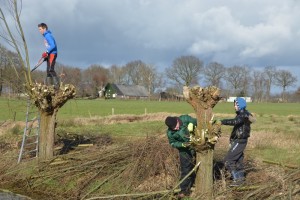 goede afspraken met elkaar maken. Natuurlijk is het altijd en beetje spannend: 60 pubers op bezoek!!!! Stel, dat ze helemaal geen zin hebben, of bang zijn voor een beetje modder of hysterisch worden als hun laarzen vollopen met water…….. Wat dan? En dat werken met gereedschap. Vlijmscherpe zagen en takkenscharen……. er zijn vast kinderen die nog NOOIT een zaag of een grote takkenschaar in hun handen hebben gehad. En wij laten ze behoorlijk flinke takken afzagen! En zo’n kind boven in een knotwilg en ook nog aan de rand van een sloot. Welke puber heeft überhaupt wel eens een wilg geknot? D’r zal er toch niet een uitvallen? Vooroordelen, aannames en beren op de weg. Allemaal konden ze de prullenbak in. Van de 60 scholieren vond een hele grote meerderheid zo’n werkmiddag hartstikke leuk. We hebben nauwelijks wanklanken gehoord. En dat gevaarlijke gereedschap ? Zegge en schrijven een keer hadden we de verbanddoos nodig: voor een heel klein pleistertje. En verder ging alles goed? Ja hoor, op een paar volgelopen laarzen en erg veel natte sokken na. Maar daar werd vooral om gelachen.