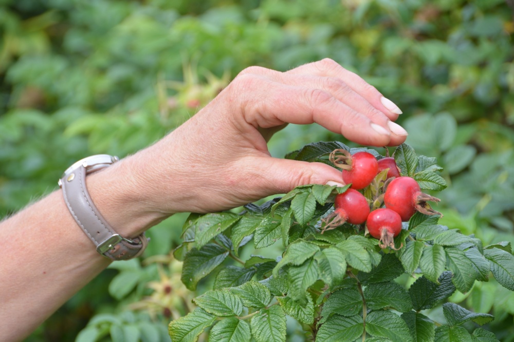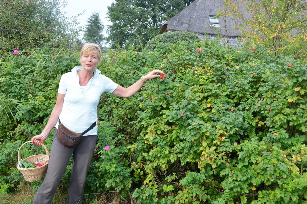 Na een kleine honderd meter volgt de eerste stop. Jacqueline vertelt over de meidoornbessen, waar je geen sap maar wel een heerlijke gelei van kunt maken. De blaadjes kunnen in de aardappelsalade. En die bessen van de Gelderse roos? Die lusten zelfs de vogels niet. Niet wanhopen, ook hiervan maak je een gelei, ook al is die bitter. Maar bitter is gezond ! De vlier, die ook langs het kerkenpad staat is natuurlijk bij iedereen wel bekend. Vlierbessen en vlierbloesem, daar kun je van alles mee. Niet iedereen weet dat vlier vroeger werd