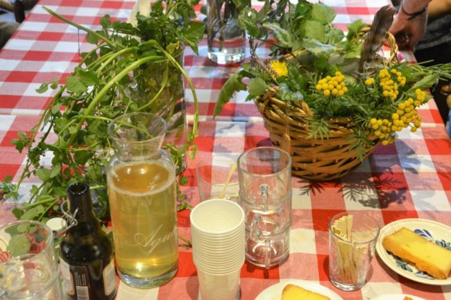 In de gelagkamer van De Wheem heeft Jacqueline een tafel ingericht met wat de natuur nu te bieden heeft. Tijdens het napraten over deze mooie en leerzame voedseltocht geniet de groep van heerlijke biologische producten als limonade van moerasspirea-siroop, een gelei van paardebloem over de cake, stukjes kaas in combinatie met een wat bittere gelei van lijsterbes. En voor de liefhebbers is er duizendbladthee. Het was een inspirerende middag. Nu zelf op zoek!
