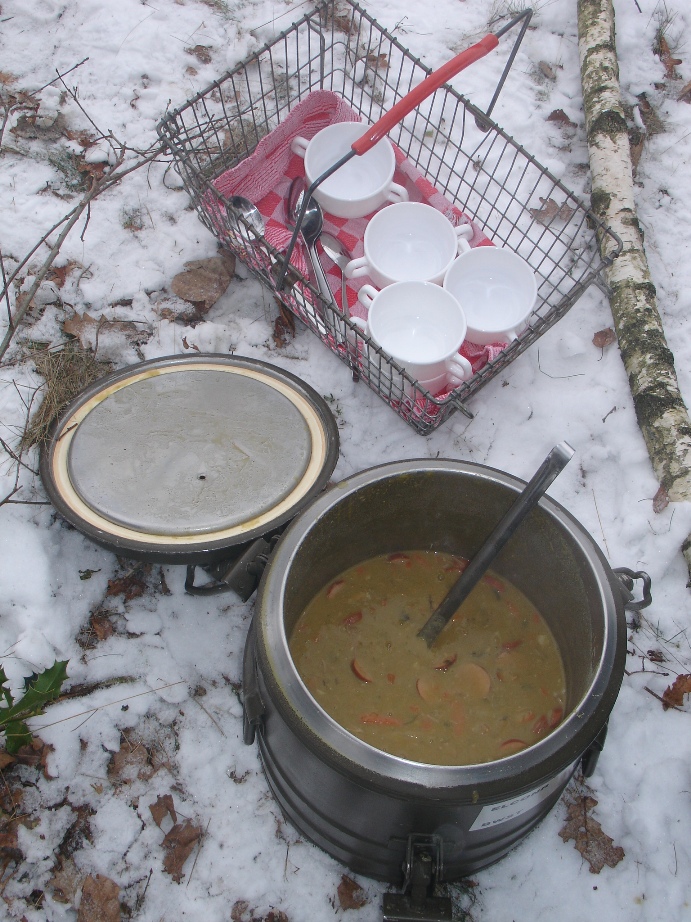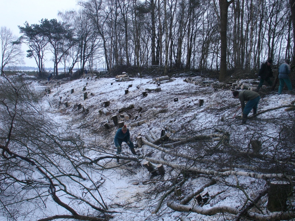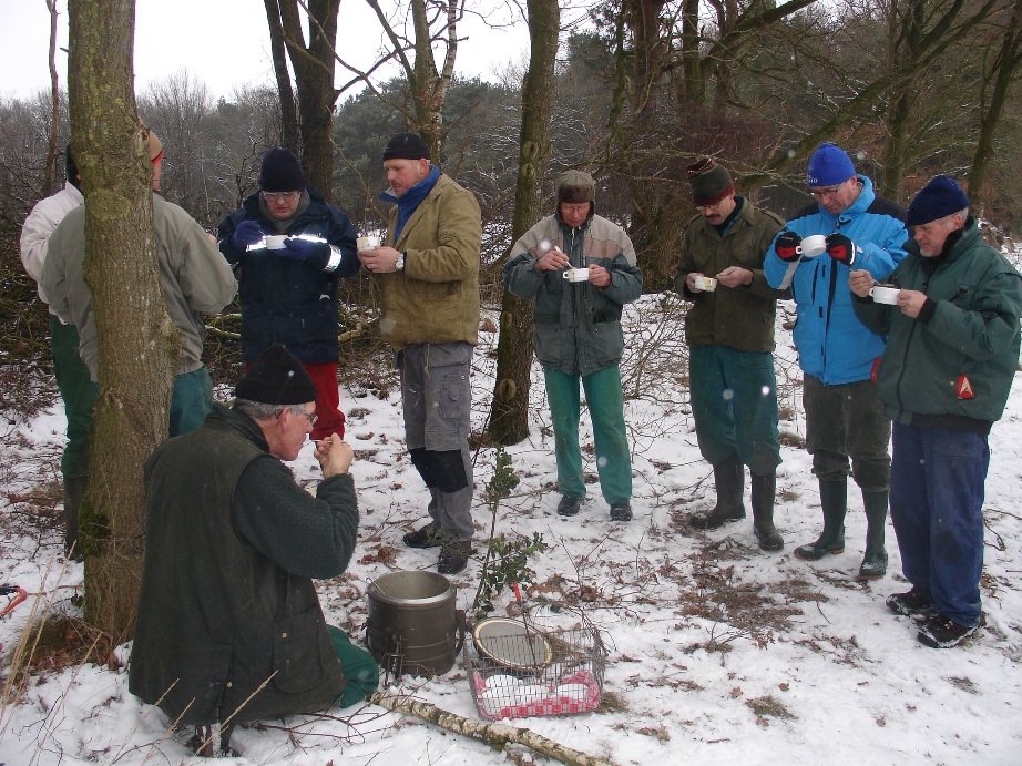 was het droog en de koude wind kwam niet verder dan windkracht 4. Tien vrijwilligers meldden zich voor de klus van deze morgen: het vrijmaken van de oevers van het Katingermeertje. Landschap Overijssel had de grote bomen omgezaagd en hiervan moest het hout worden opgeruimd. De takken werden op “rillen” in het bos gelegd. Deze stapels leveren straks prachtige broedgelegenheid voor zangvogels op. De grote stukken boomstam werden op stapels gelegd voor de klanten van brandhout. Echt koud had niemand het en de lekkere snert (met dank aan Hennie Krol) ging er weer goed in. Aan het eind van de morgen konden we tevreden terugzien op twee geslaagde klussen rond het Katingermeertje.