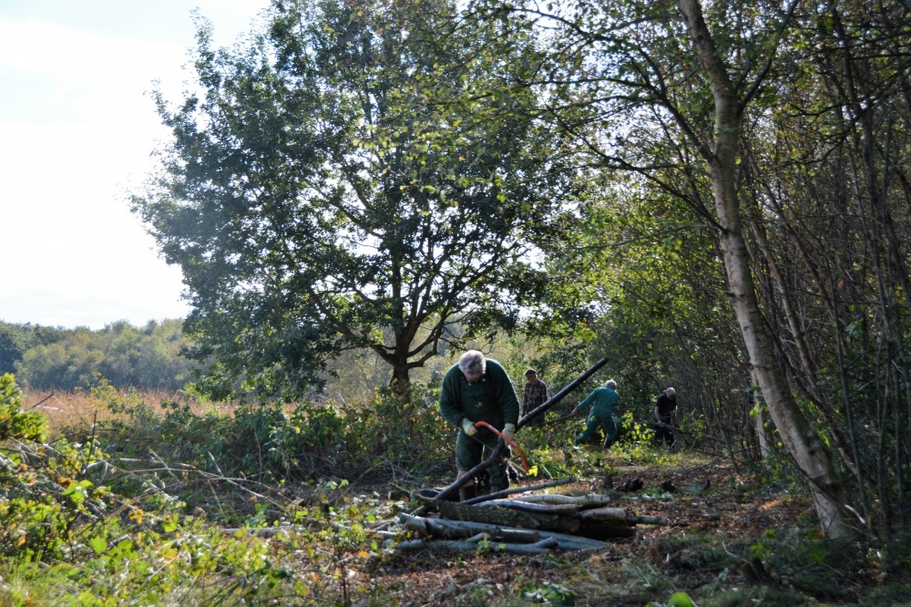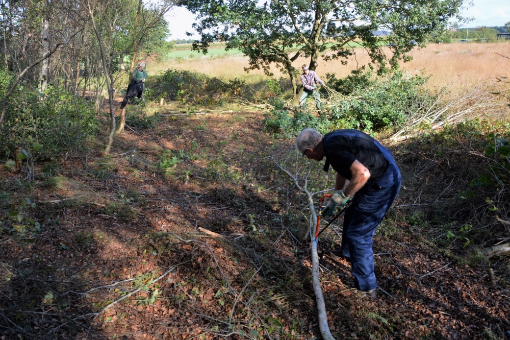 heten verzuring, zaailingen van vooral berk en oprukkend bos. Dat de struikheide hier bijna overwoekerd is door manshoge pollen van het pijpenstrootje komt zeer waarschijnlijk door het neerdalen van stikstof. Uitstoot van verkeer, landbouw en industrie dwarrelt het hele jaar door neer. Grassen genieten hiervan, de heide houdt juist van armoedige grond en verpietert. Op deze zaterdagmorgen bestrijdt de werkgroep een van deze belagers: het oprukkende bos.