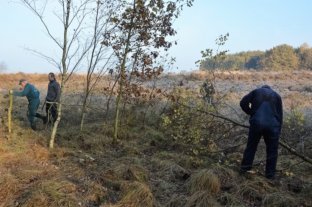 Op deze zaterdag gaat de werkgroep er mee door. Het is koud, het vriest twee graden. De heide is wit en berijpt. Maar het zonnetje schijnt. De plek waar de groep aan het werk gaat is een heerlijke locatie om de handen te laten wapperen. Je hebt een prachtige kijk over de heide en kijkend naar het noorden zie je de uitgestrektheid van het Westerhuizingerveld. De tien vrijwilligers gaan direct aan het werk. Dat moet ook wel, anders koel je snel af. Tientallen kleine en grote berken leggen het loodje.