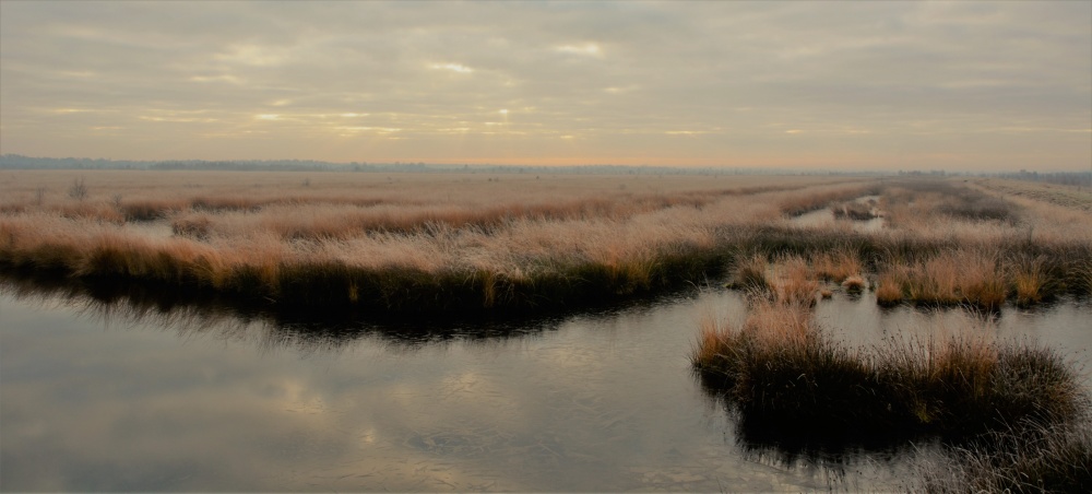 Dat er op het bordje staat dat de toegang alleen toegestaan is tussen zonsopgang en zonsondergang ziet niemand. Het is natuurlijk ook een farce. Na een paar honderd meter wordt het gebied open en vanuit een centraal uitkijkpunt kan iedereen zich voorbereiden op het moment dat de zon op komt. In het oosten kleurt de lucht langzaam oranje. Vier wilde zwanen vliegen twee keer precies door de oranje gloed maar worden door vrijwel iedereen gemist. Steeds feller kleurt de oostelijke einder zich, maar die grote rood/oranje bol laat zich niet zien. Er is teveel bewolking. Maar de wolken zijn dun en er vallen gaten in. Het zonlicht wordt op deze morgen gebroken door een dunne schil en dat komt een fotograaf altijd goed uit. Het licht is zacht en diffuus en daar kun je prachtige foto’s mee maken!