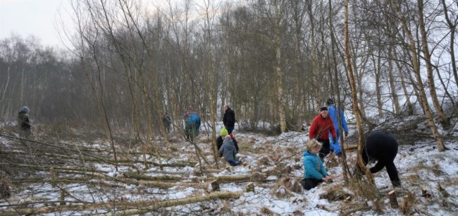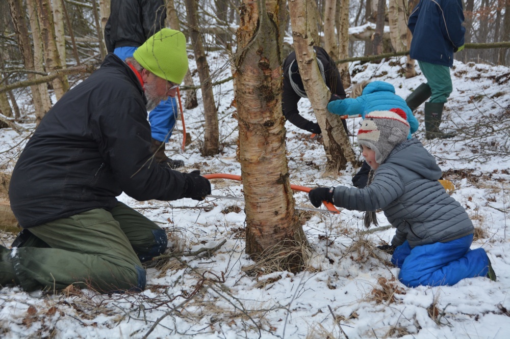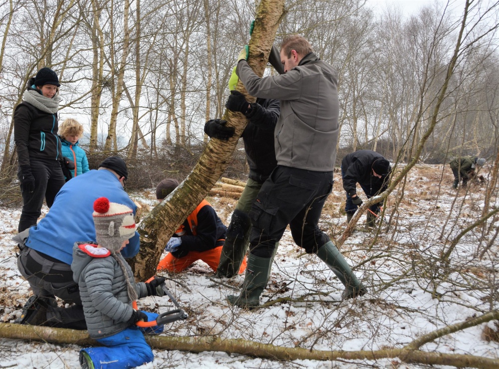 Onder winterse omstandigheden ( het is behoorlijk koud en er ligt sneeuw) begint de groep waar de vorige keer is gestopt. Het duurt dan ook niet lang of de eerste berkenbomen gaan om. Van bomen zagen word je lekker warm. Eerst moet de boom om, dan zaag je de takken eraf. Die sleep je de bosrand in en leg je op een ril. Alle takken in dezelfde richting. Rillen dienen als belangrijke schuilplaatsen voor vogels en klein wild. Vervolgens zaag je de boomstam in stukken van ongeveer 1.20 m. Die leg je dan op een bult. Geschikt voor de houtkachel.