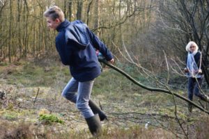 De groep groep scholieren met wie we dit seizoen in het landschap klussen bestaat uit negen tweedejaars leerlingen van het Vechtdal College in Dedemsvaart. Met deze school werken we inmiddels vier jaar samen. Op dinsdagmiddag 6 februari konden de scholieren hun energie goed kwijt, want er moest nog even flink gezaagd, geknipt en gesleept worden. Vooral de krentenbomen gaven veel werk. Aan de randen van de terreintjes werden de takken op rillen gegooid. Daar profiteren straks vogels en kleine zoogdieren van. De veldjes krijgen weer veel licht en de heide zal hiervan profiteren. Net als de vlinders die op de bodem in de eerste zonnewarmte op temperatuur kunnen komen. Aan het eind van de werksessie smaakte de warme chocolademelk met slagroom prima! De twee herstelde heideveldjes liggen in het bos langs het kerkenpad dat komend vanaf het Reestbruggetje rechtdoor het bos in gaat. We gaan dit werkseizoen nog twee middagen aan het werk.