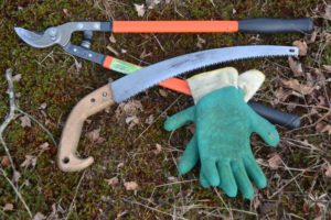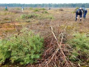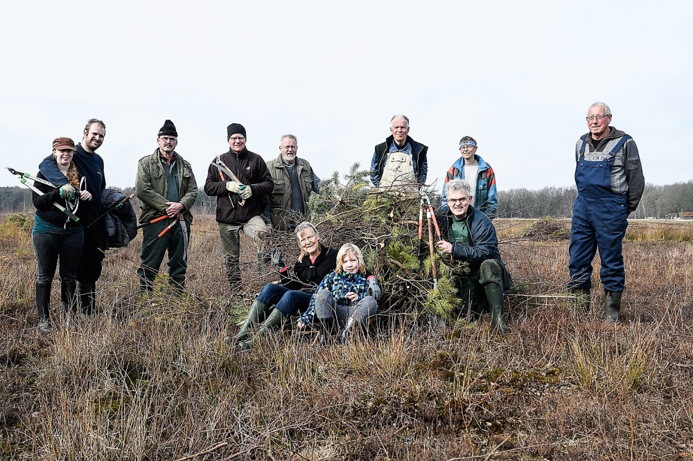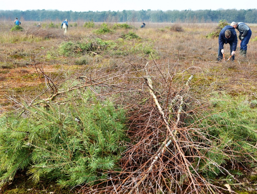 Rond de klok van 09.15 u zijn we er allemaal. Vorige maand was de groep wat groter, maar nu, met een man/vrouw of dertien kunnen we weer een hele grote slag slaan. Van Chris krijgen we het gereedschap. We kunnen kiezen: de takkenschaar, de kleine zaag of de spade. Bij de meesten gaat de voorkeur uit naar de combinatie takkenschaar/zaag. Logisch, de meeste boompjes zijn te groot om te worden uitgespit. Kleine dennetjes trek je er met de hand zo uit. De berken en grotere dennen zaag je vlak boven de grond af. Heidebeheer: het is tuinieren in het groot. Niet te veel bij nadenken, niet te veel voor je uit kijken, je zou eens mismoedig kunnen worden. Wat staat er nog een opslag ! Wanneer is dit project ooit klaar ? Het antwoord is snel gegeven : NOOIT! En dat is ook niet erg. Overal waar we komen staat bijna geen boompje meer in de hei. Als een stel hongerige grote grazers werken we elke strekkende meter af. Alle uitgestoken, gezaagde en geknipte boompjes gooien we op bulten. Hier en daar laten we wat opslag staan. Voor de variatie. Het Rabbingerveld wordt anders wel een erg eentonige vlakte. Misschien wordt zo’n berkje wel een uitkijkpost voor een roodborsttapuit of graspieper.