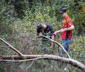 De eerste klus was natuurlijk eerst wat onwennig. Wennen aan elkaar, aan het gereedschap en aan het werk dat je moet doen. De klus bestond uit het wegknippen van talloze vuilboompjes uit een heideveldje bij het Spookmeertje. Het gebied is in beheer van Het Drentse Landschap. Het uniek van het veldje is de aanwezigheid van de drie heidesoorten dopheide,struikheide en kraaiheide. Bovendien staan er nog wat oude en jonge jeneverbessen. Net als de heide hebben deze bomen veel licht en ruimte nodig. Dus op de bres voor de jeneverbes, eruit met al die opslag. De dertien scholieren mochten zich uitleven op de uitlopers van struiken die we liever niet in de heide hebben. Na afloop van deze eerste werkmiddag was er veel gedaan. Volgende week gaan we verder.